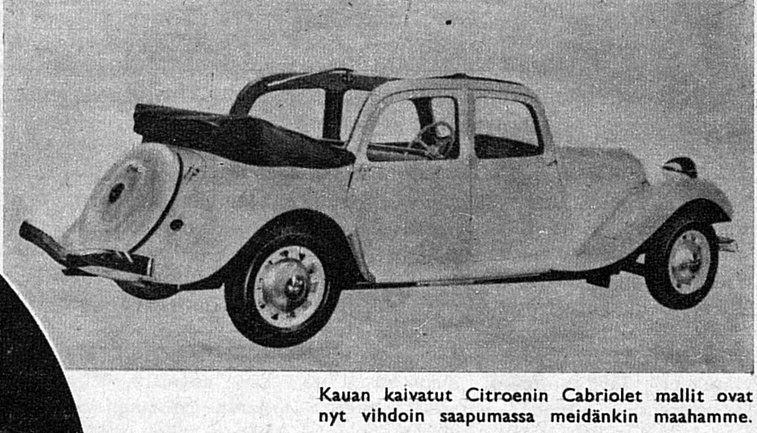 Musta Cabriolet saapui Suomeen 7. maaliskuuta 1939, eli juuri ennen Helsingin messuhallissa järjestettyä kansainvälistä autonäyttelyä. Tämä yksilö mitä ilmeisemmin on sama auto, joka tallentui myös suomalaiseen elokuvahistoriaan. Saman vuoden heinäkuussa saapui lisäksi toinen Citroën-harvinaisuus, metallinhohtovihreä ”Cabrio-Limousine” eli neliovinen Sport avattavalla kangaskatolla.
