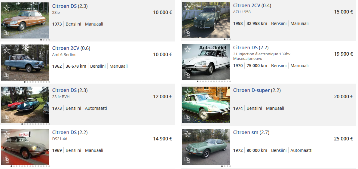 D-mallien lisäksi mukana on myös SM, Ami 6 ja 2CV paku, eli aika monipuolinen mallivalikoima hienoja Citikoita. En osaa arvioida kysyisten auton hintapyyntejä, mutta esimerkiksi euroopasta ei kovin kummoista D-mallia enää saa kymppitonnilla.