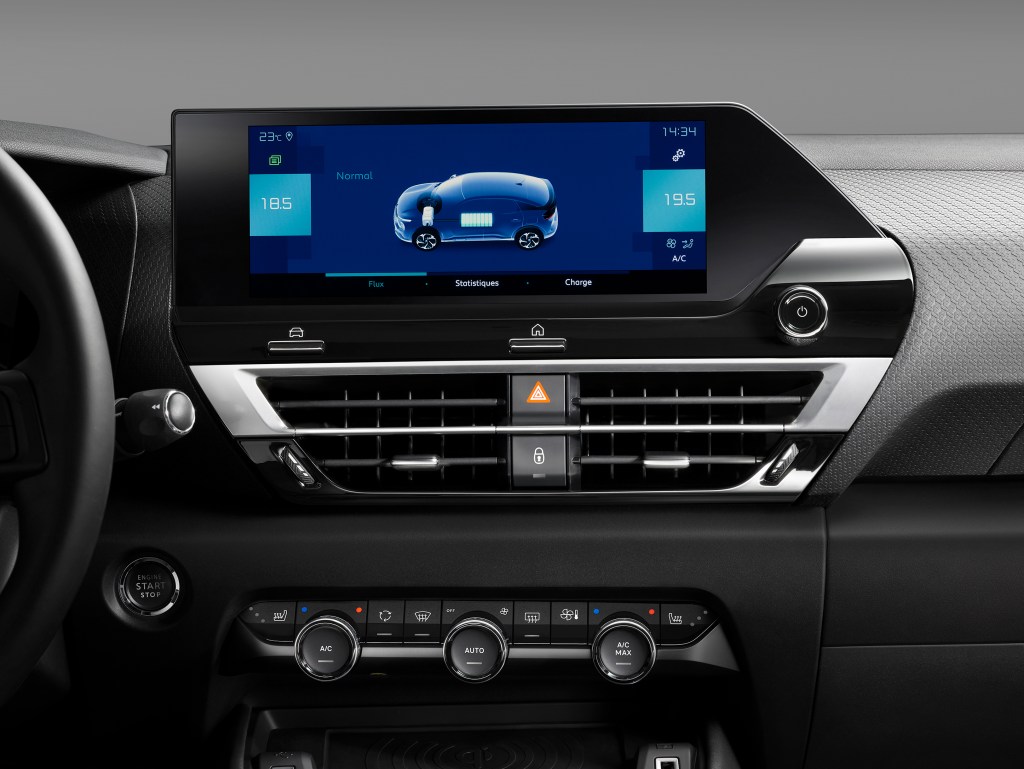 Integroitu 10″ näyttö toimii auton toimintojen ohjauksen käyttöliittymänä, mutta lämmityksen säätö on palautunut ohjattavaksi mekaanisten nappuloiden kautta. Järkevä myönnytys.