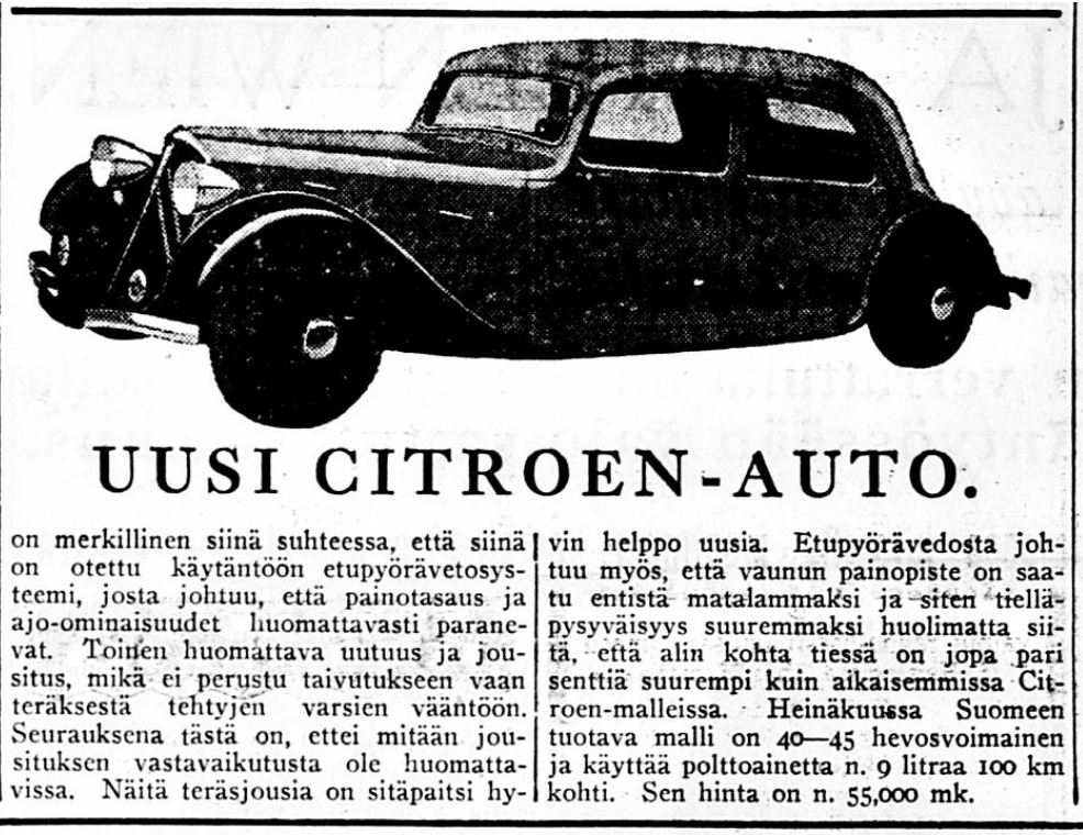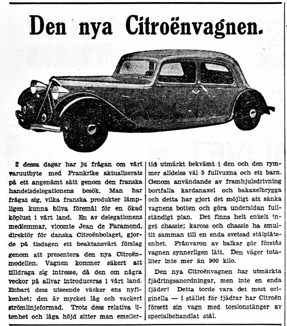 Citroën Traction Avant oli monella tapaa rakennettu totutun autonrakennustavan vastaisesti. Tähän päätelmään tulee luettuaan Helsingin Sanomien toimittajien tutustumisesta autoon 20. kesäkuuta 1934. Samana päivänä uutuudesta kerrottiin myös muissa päälehdissä.