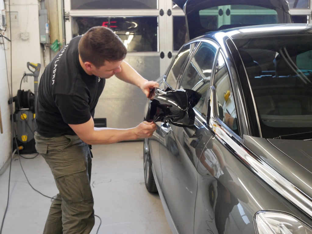 Lopulta päädyttiin korostamaan auton panoraamakattoa teippaamalla A-pilari ja oven yläreunat kiiltävällä mustalla. Se sopii hyvin auton kiiltävän mustaan B-pilariin ja mustiin takasivulaseihin. Lisäksi peilin kopat teipattiin niin ikään kiiltävällä mustalla.