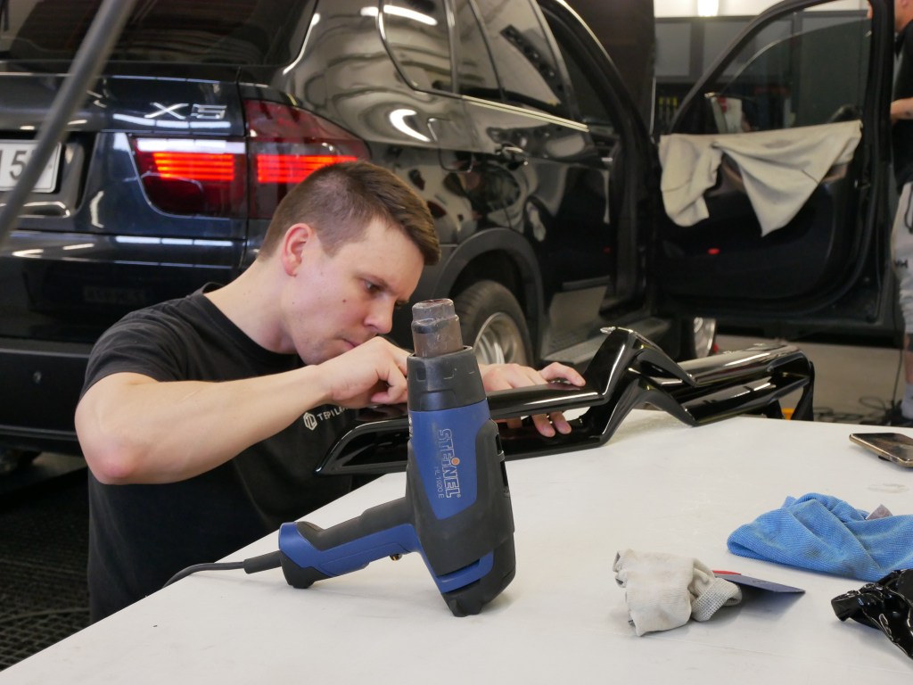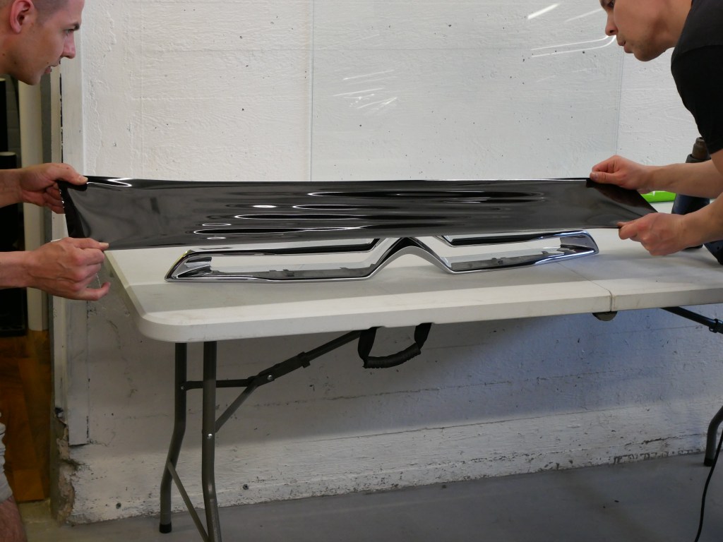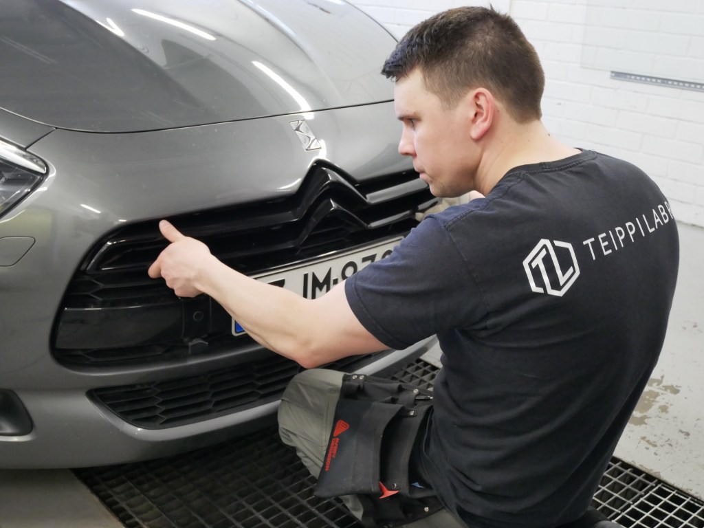 Kromin kiiltoa vähennettiin auton keulan osalta teippaamalla Citroën-merkki kiiltävällä mustalla. Merkki oli helposti irroitettavissa, joka hieman helpotti työtä, mutta haastava se oli silti. Ammattilaiselta se kuitenkin onnistui hienosti ja lopputulos on virheetön.