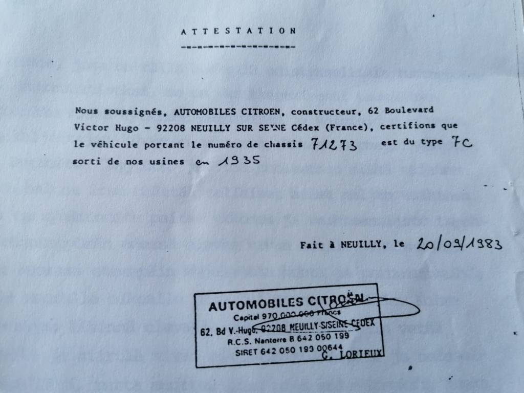 Kyseinen Traction Avant 7C tullattiin Suomeen 22.4.1936. Se valmistui kuitenkin tehtaalta jo vuonna 1935. Todennäköisesti auto tuli Tanskan maahantuonnin kautta ja siksi matka tänne Suomeen kesti niin kauan. Myös Citroën tehtaan konkurssi on voinut vaikuttaa asiaan.