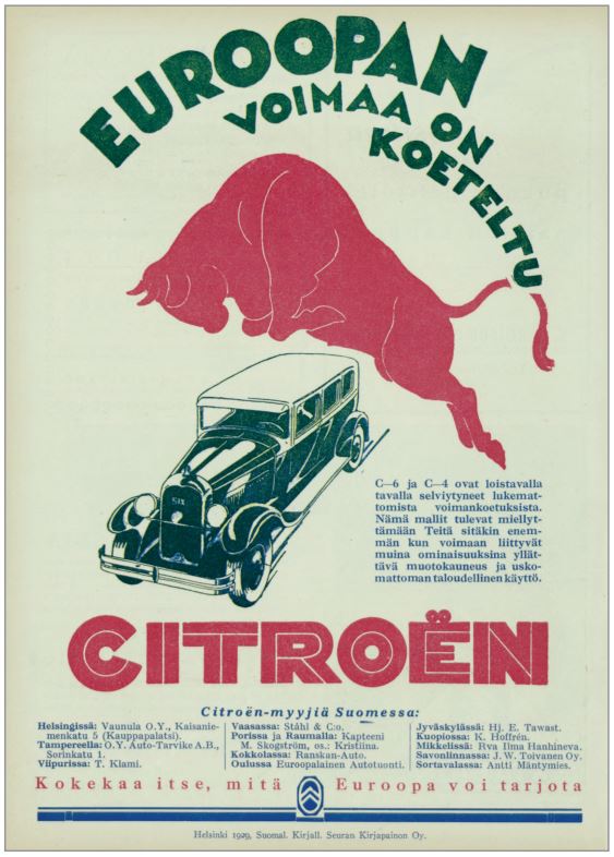 Lokakuussa 1928 Citroën-tehtaat päättivät perustaa uuden organisaation hoitamaan Suomen toimintoja. Sen päälliköksi nimitettiin johtaja Fredrik Palmros. Suoramyyntiä hoitaisivat yhtiön entiset edustajat, eli siis Velocitas Oy Uudellamaalla ja Viipurissa.