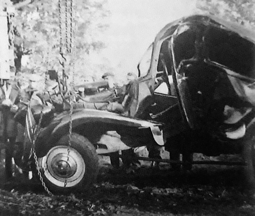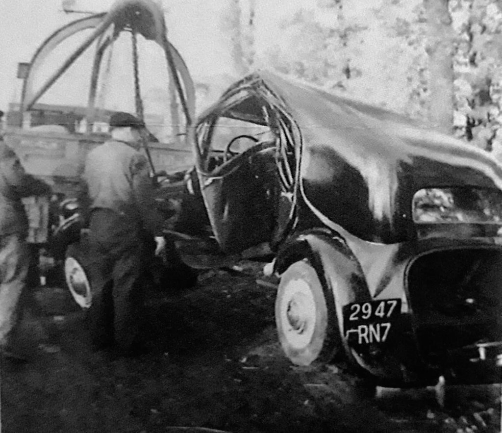 Kello on 13.15 lauantaina, 11. marraskuuta 1950 maanviljelijä Jastrelski ajaa pikkutietä, joka johtaa RN9:lle Broût-Vernetissä, muutaman kilometrin päässä Gannatista, Allierista. Hän näkee mustan Citroën Traction Avantin ajavan melko nopeasti Clermont-Ferrandia kohti. Kun hän ajoi traktorilla Nationalea pitkin, hän kuuli kaukaa onnettomuuden ääniä. Traction Avant oli heittelehtinyt ja päätynyt lopulta valtavalla voimalla kuljettajan kylki edellä päin puuta. Auto oli kuin kiertynyt puun ympärille. Hän ryntäsi paikalle, mutta ei voinut tehdä kuljettajan hyväksi mitään. Hän oli ilmeisesti kuollut välittömästi ja juuttunut matkustamoon. Kuljettaja vaimo oli loukkaantunut ja voihki hiljaa. Apua järjestettiin paikalle ja matkustaja kiidätettiin Clermont-Ferrandin sairaalaan, jossa hän myöhemmin toipuu onnettomuudesta.