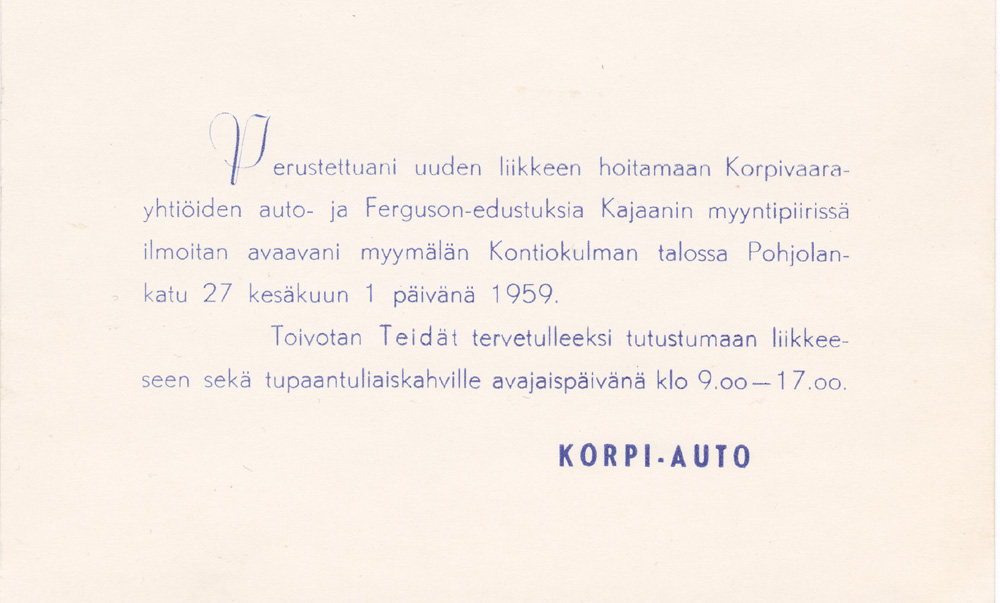 Valokuva-albumien kätköistä ilmestyy toisinaan päivänvaloon historiallisia kuvia. Tällä kertaa nämä kuvat valottavat kajaanilaisen autokaupan historiaa autoliikkeestä, joka 1950-luvun lopulla avasi ovensa ja alkoi myydä Korpivaaran tuotteita.
