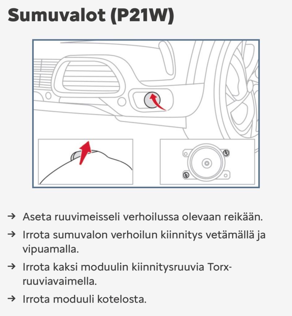 Itse lamppuyksikön vaihto on yhtä helppoa kuin polttimon vaihto ja siihen on olemassa käyttöohjeessa kuvalliset ohjeet. Tosin ohjeissa on harhaanjohtavasti lampun tyyppi väärin (P21W kun pitäisi tietenkin olla H11).