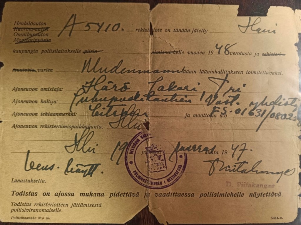 Lankisen Citroën 7C vaurioitui kolarissa ja hän päätti vaihtaa sen uuteen metalliharmaaseen (gris irisé) 11 Sportiin syyskuussa 1937. Vaurioitunut auto kuitenkin korjattiin. Auton osti Alavudelta Tri Sakari Härö, joka oli muuten sukua Korpivaaralle. Härö valmistui lääkäriksi vuonna 1946. Hän toimi pääosan jatkosodasta rintamapalveluksessa lääkärinä. Sodan alussa hän palveli myös pommikoneen suunnistajana.