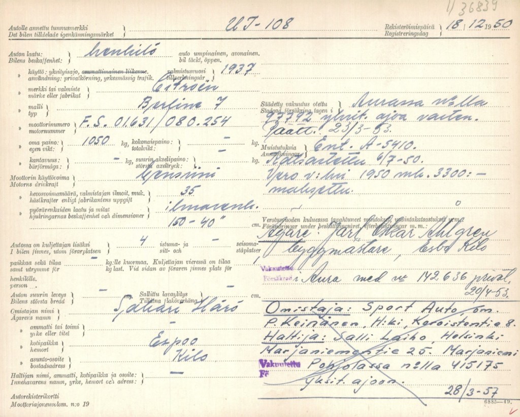 Asiakirjoista voidaan päätellä, että auto sai 18.12.1950 tunnuksen UI-108 ja Härön omistus päättyi vuonna 1953. Vuodesta 1953 auto oli Jarl Oskar Ahlgrenin omistuksessa aina 30.3.1957 saakka, jolloin auto rekisteröitiin AF-130 tunnuksilla Sport Auto P.Keinäsen nimiin. Auton haltijana oli tuolloin Salli Laiho. Tähän päättyvät Lankisen auton jäljet, mutta pitkään se kolarin jälkeen vielä palveli.