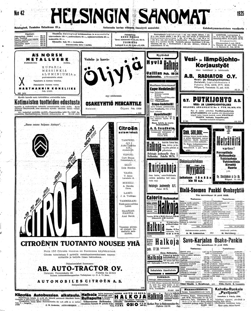 Näin mainostettiin Citroënin autoja sata vuotta sitten Helsingin Sanomien etusivun mainoksessa. Lisäksi kerrottiin, että Suomessa oli tuolloin 150 Citroën autoa käytännössä. Varsinkin Citroën 5HP oli Euroopassa naisautoilijoiden suosiossa, johtuen sähkökäynnistyksestä ja ajamisen keveydestä.
