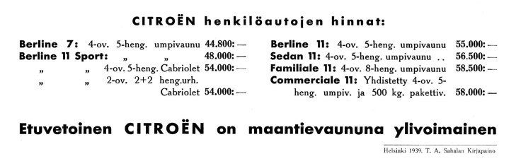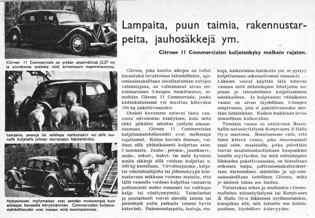 Tämäkin vaunu on nähtävänä Messuhallin autonäyttelyssä Korpivaara & Halla Oy:n osastossa. Mainitsemme vielä, että tämä kätevä vaunu, joka erinomaisesti sopii esim. maalaisille, jotka päivittäin tuovat maataloustuotteitaan kaupunkien toreille myytäviksi, tai mitä erilaisimpien liikkeiden pakettivaunuksi, on hinnaltaan erikoisen halpa, polttoaineenkulutukseltaan äärimmäisen säästeliäs ja ajo-ominaisuuksiltaan todellinen Citroen, mikä jo sinänsä takaa sen laadun. –Automies-lehti 1939
