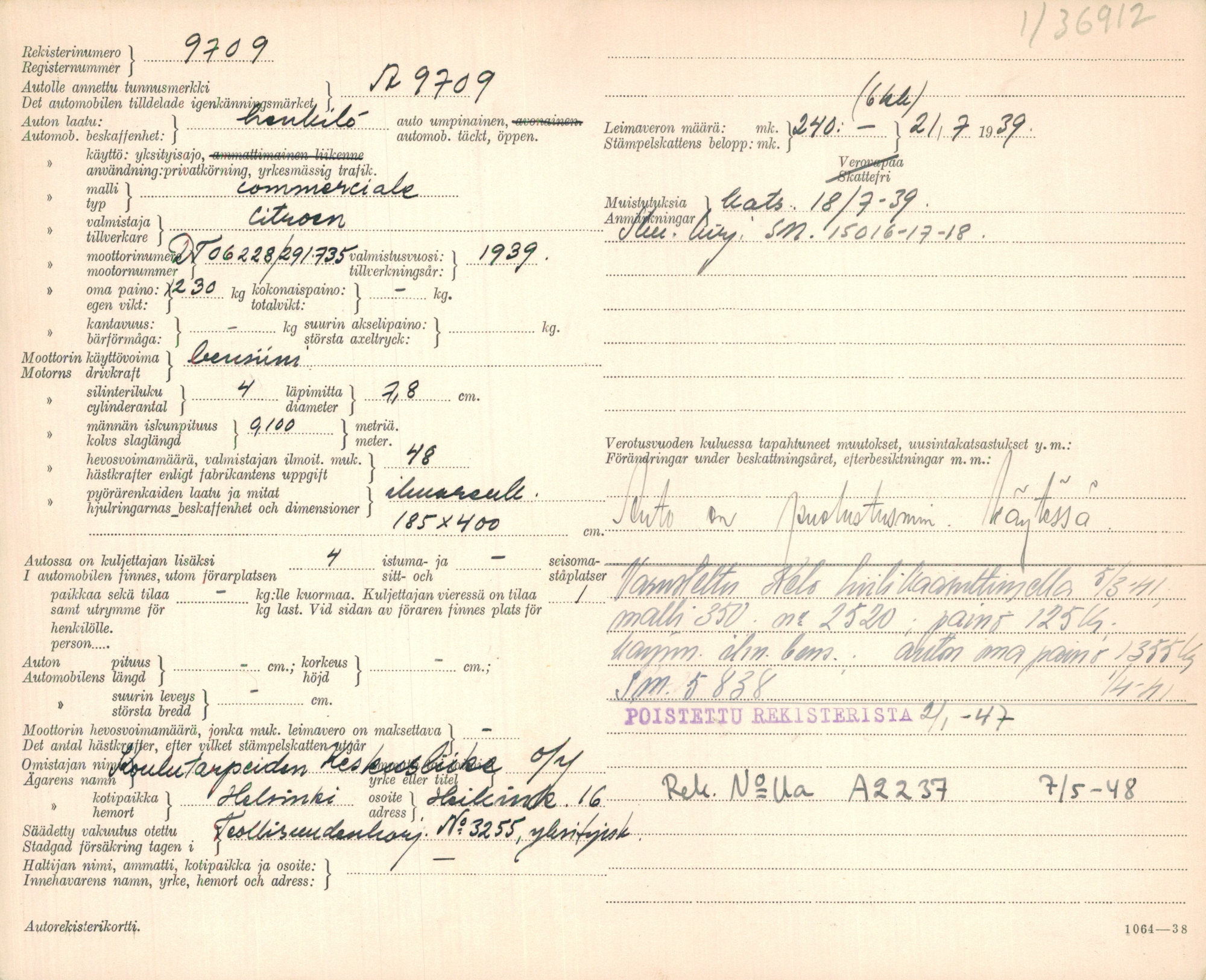 Kun poikkeusjärjestelyt vähitellen purkautuivat, Commerciale poistettiin rekisteristä 2.1.1947. Monien sota-ajan autojen korteissa toistuu sama päivämäärä: 2.1.1947. Tämä selittyy merkittävällä puhdistuksella, jolla sota-ajan sekasorto ja ”haamuautot” siivottiin pois rekistereistä. Viranomaiset poistivat kirjoista kaikki ne ajoneuvot, joita ei ollut esitetty uudelleen katsastettaviksi määräaikaan, eli vuoden 1946 loppuun mennessä. Moni auto jäi tuolloin ”nukkumaan” huutavan rengas- ja osapulan vuoksi, jääden odottamaan parempia aikoja.