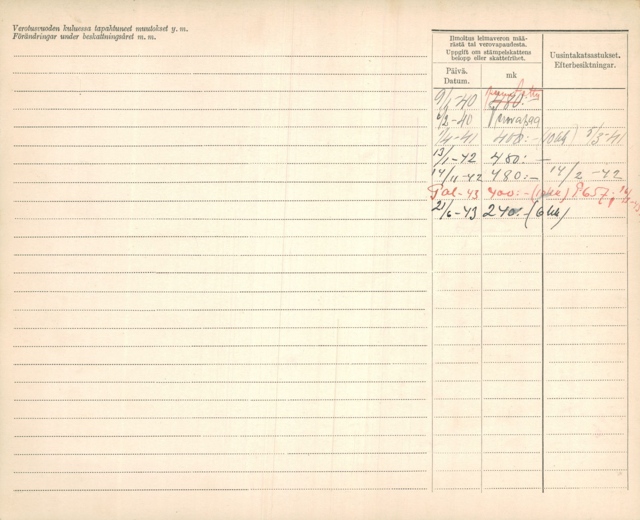 Kantakortin kääntöpuolelta selviää edelleen, että vuoden 1940 leimavero 9. tammikuuta on peruutettu ja auto merkitty verovapaaksi 6. helmikuuta. Tämä vahvistaa sen olleen kyseisen vuoden alusta suojeluskunnan käytössä.