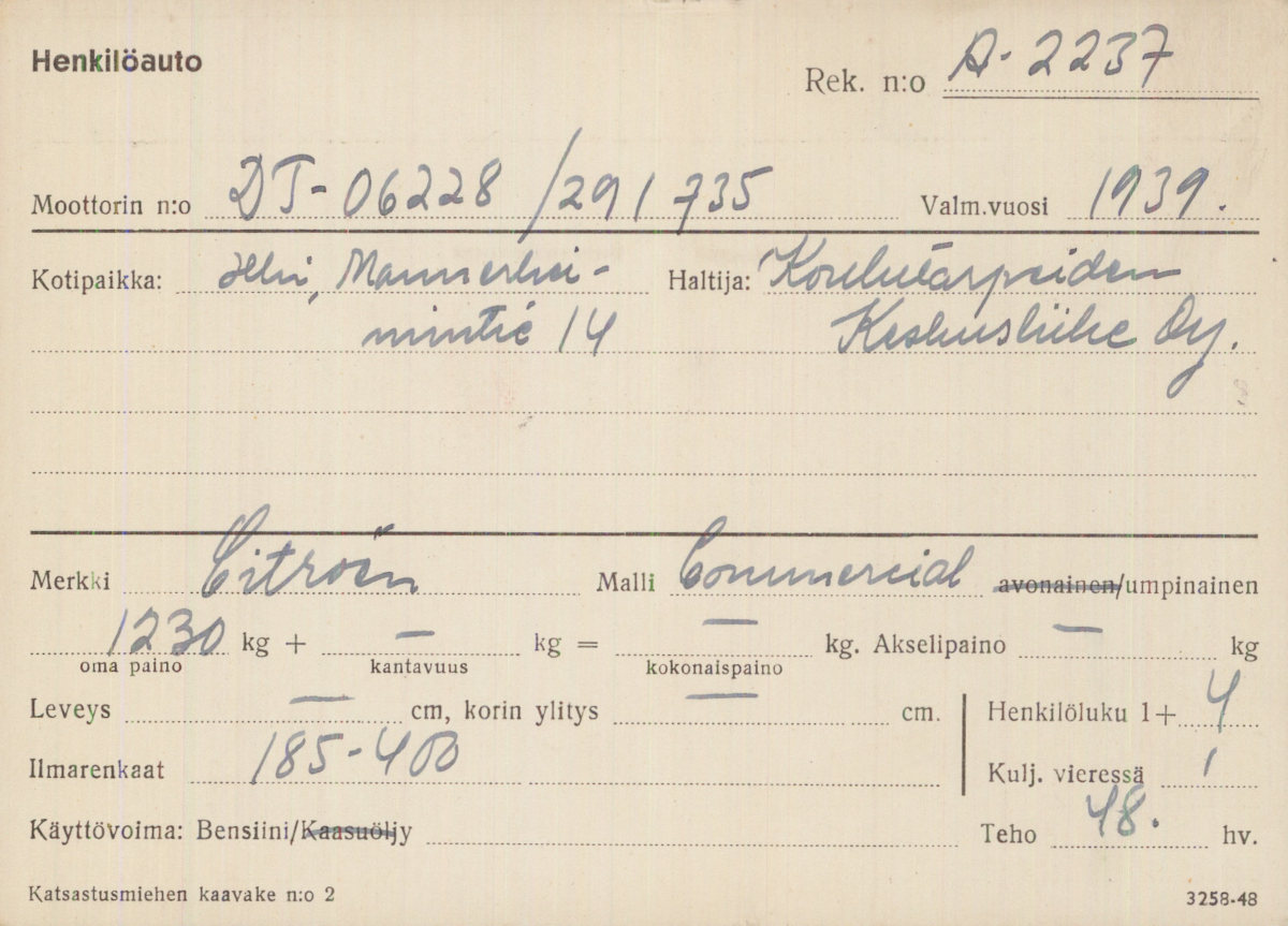 Valitettavasti tämän auton dokumentoidut jäljet päättyvät vuoteen 1951. Autosta ei ole myöskään tiedossamme yhtään valokuvaa. Tämä on kuitenkin erinomainen esimerkki siitä, miten kiehtovan ja monitasoisen tarinan yksi ainoa säilynyt kantakortti voi meille kertoa. Kauniilla käsialalla tehdyt merkinnät ovat hiljaisia todisteita ajasta, jolloin jokainen resurssi valjastettiin yhteiseen selviytymiseen.