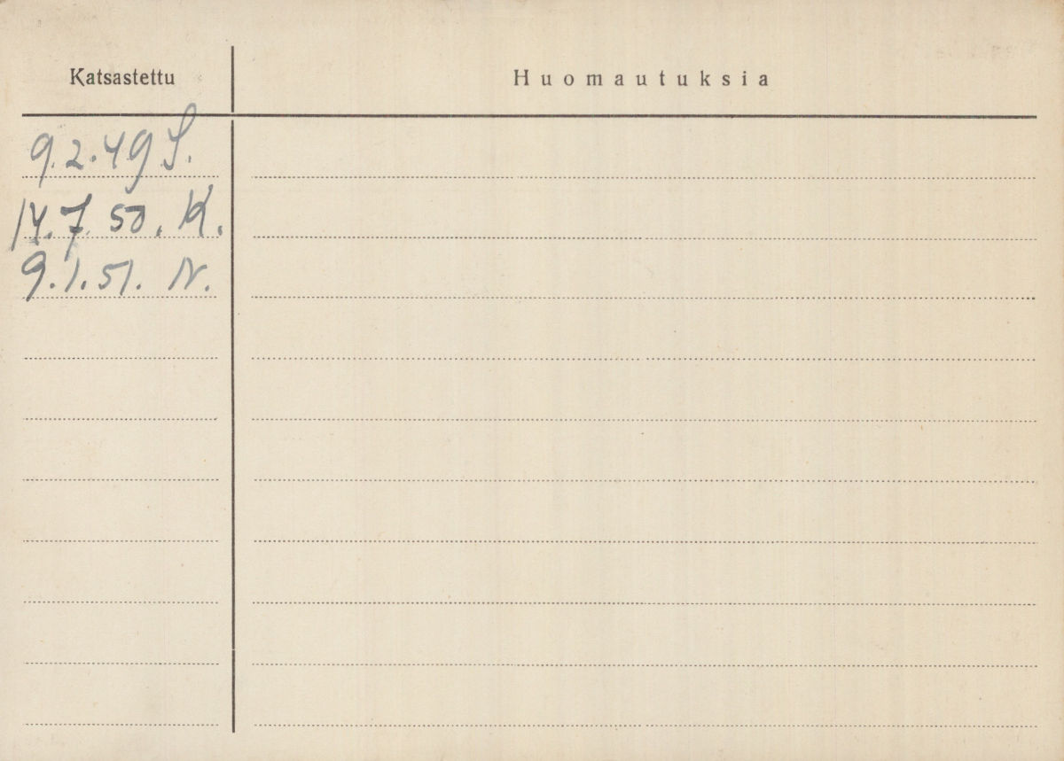 Auto on seuraavien vuosien aikana katsastettu kolmesti: ”9.2.49 S.”, ”14.7.50 K.”, ”9.1.51 N.”. Katsastuspäivämäärän perässä olevat kirjaimet ovat katsastuksen suorittaneen katsastusmiehen nimikirjaimet. Tämä oli yleinen käytäntö, jolla katsastuskonttori piti kirjaa siitä, kuka virkamies oli tarkastanut ajoneuvon ja todennut sen olevan teknisesti kunnossa.