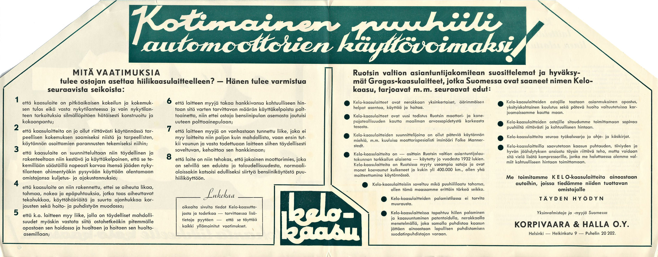 Mainittu hiilikaasutin ”Kelo 350” johtaa mielenkiintoiseen sivuhaaraan tarinassamme. Korpivaara & Hallan rooli on entistä keskeisempi, sillä yritys toimi paitsi Citroën-maahantuojana, myös valmistutti ja edusti Kelo-hiilikaasutinlaitteita sota-ajan poikkeusoloissa. Puuhiilen käyttö polttoaineena erotti Kelon monista muista sota-ajan ”häkäpöntöistä”, jotka toimivat puupilkkeellä. Puuhiilikäytössä oli tiettyjä etuja, mutta se vaati myös omanlaisen rakenteensa.